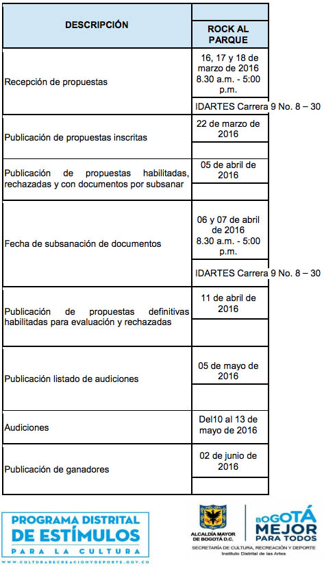 Continuando con el cronograma de actividades frente al proceso de selección de artistas distritales que participarán en la edición 2016 de ROCK AL PARQUE, IDARTES ha publicado el listado de las 357 propuestas recibidas durante la primera fase del proceso. La publicación de propuestas habilitadas, rechazadas y con documentos por subsanar se realizará el próximo 5 de abril de 2016 en el sitio web www.idartes.gov