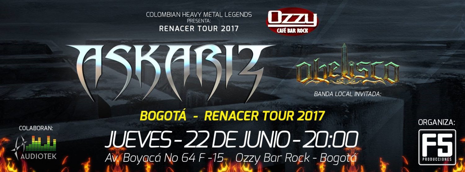 Acompañando a Askariz, estará la banda bogotana de heavy metal OBELISCO, conformada en el año 2007, influenciada musicalmente por Hammerfall, Helloween, Saratoga, WarCry, Tierra Santa, Kraken, Avalanch & Angra, entre otras grandes bandas.