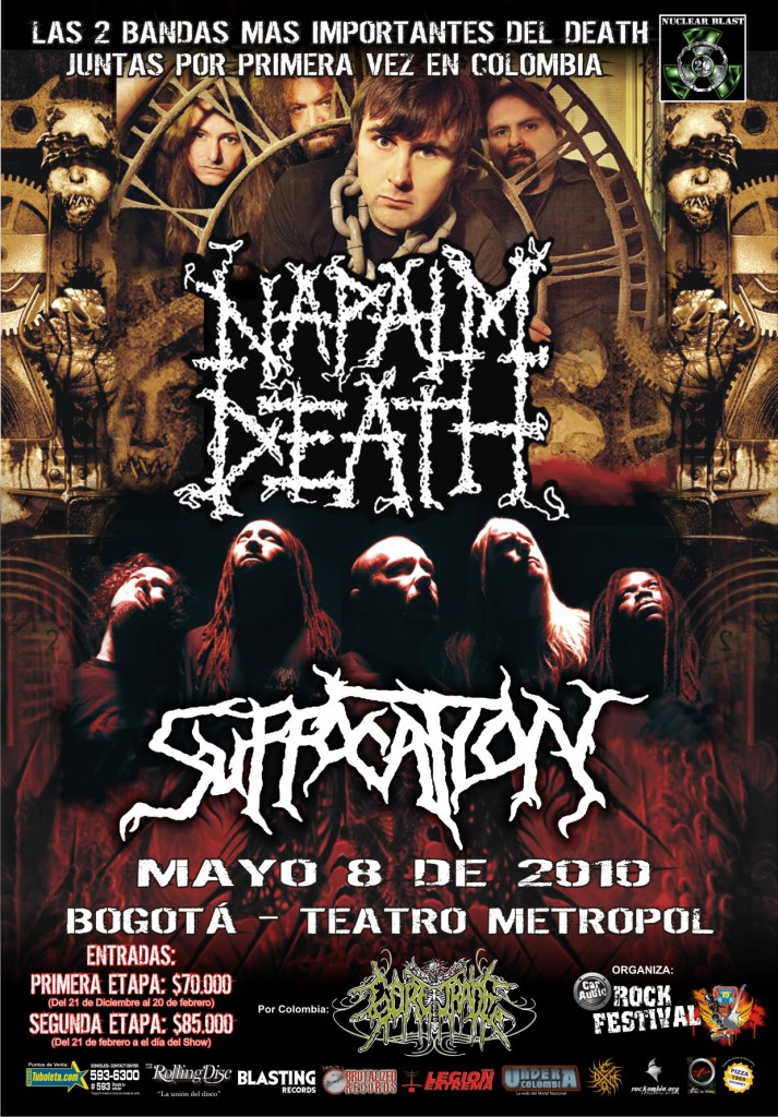Los maestros ingleses NAPALM DEATH han confirmado su próxima gira latino américana en compañia de la agrupación norteamericana SUFFOCATION la cual se realizará durante el mes de mayo del presente año, agendando fechas para Colombia, México Perú, Ecuador, Chile, Argentina, Brasil y Venezuela.