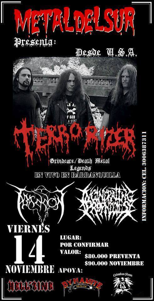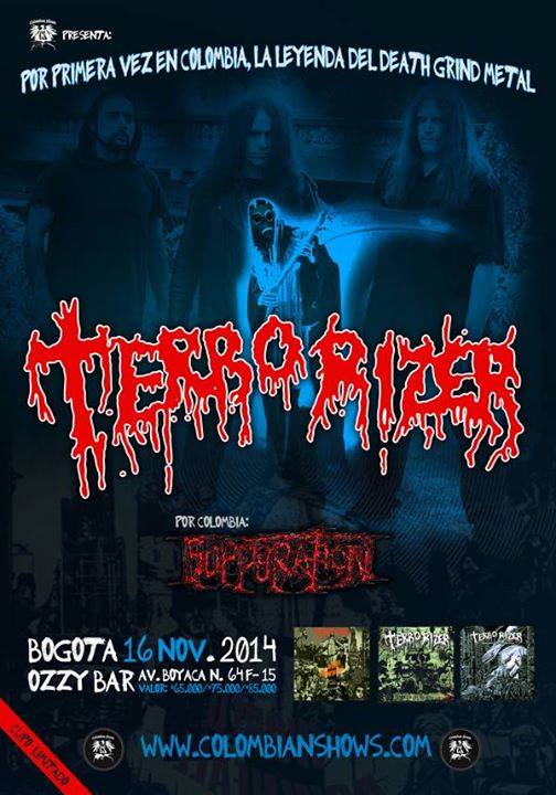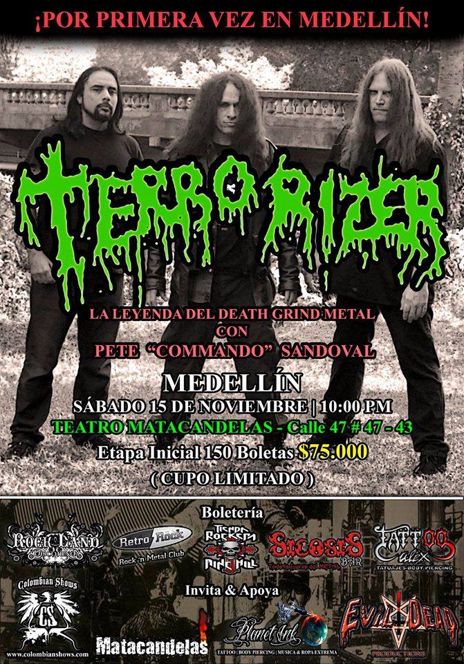 Llega por primera vez a Colombia TERRORIZER, la banda liderada por Pete «Commando» Sandoval la leyenda estará por primera vez a Colombia realizando tres presentaciones los días 14, 15 y 16 de noviembre en Barranquilla, Medellín y Bogotá respectivamente.