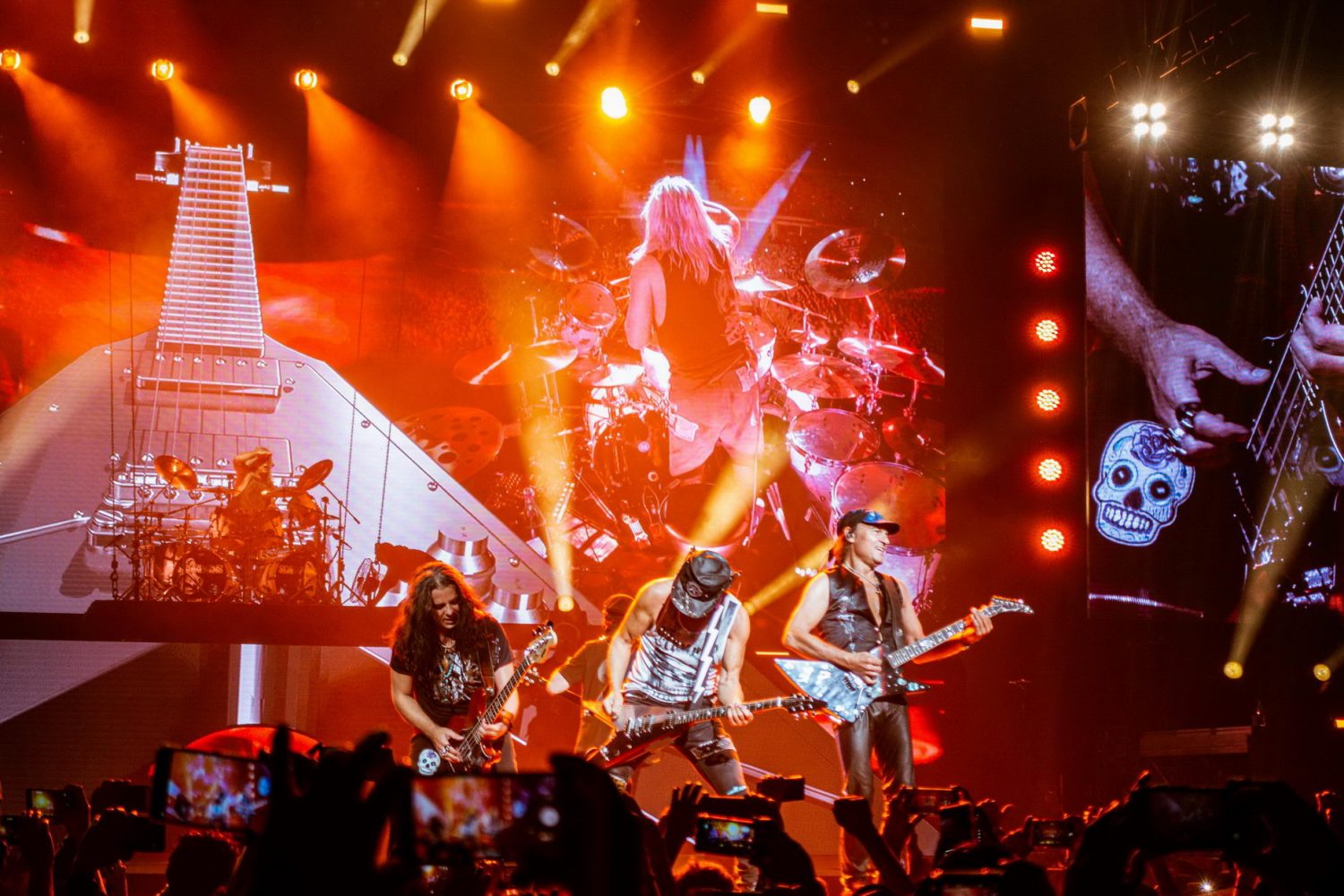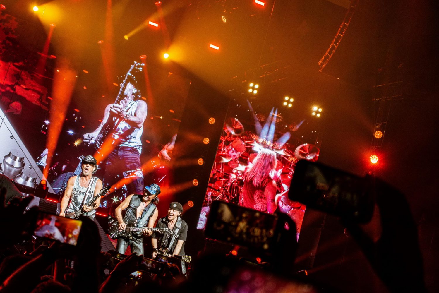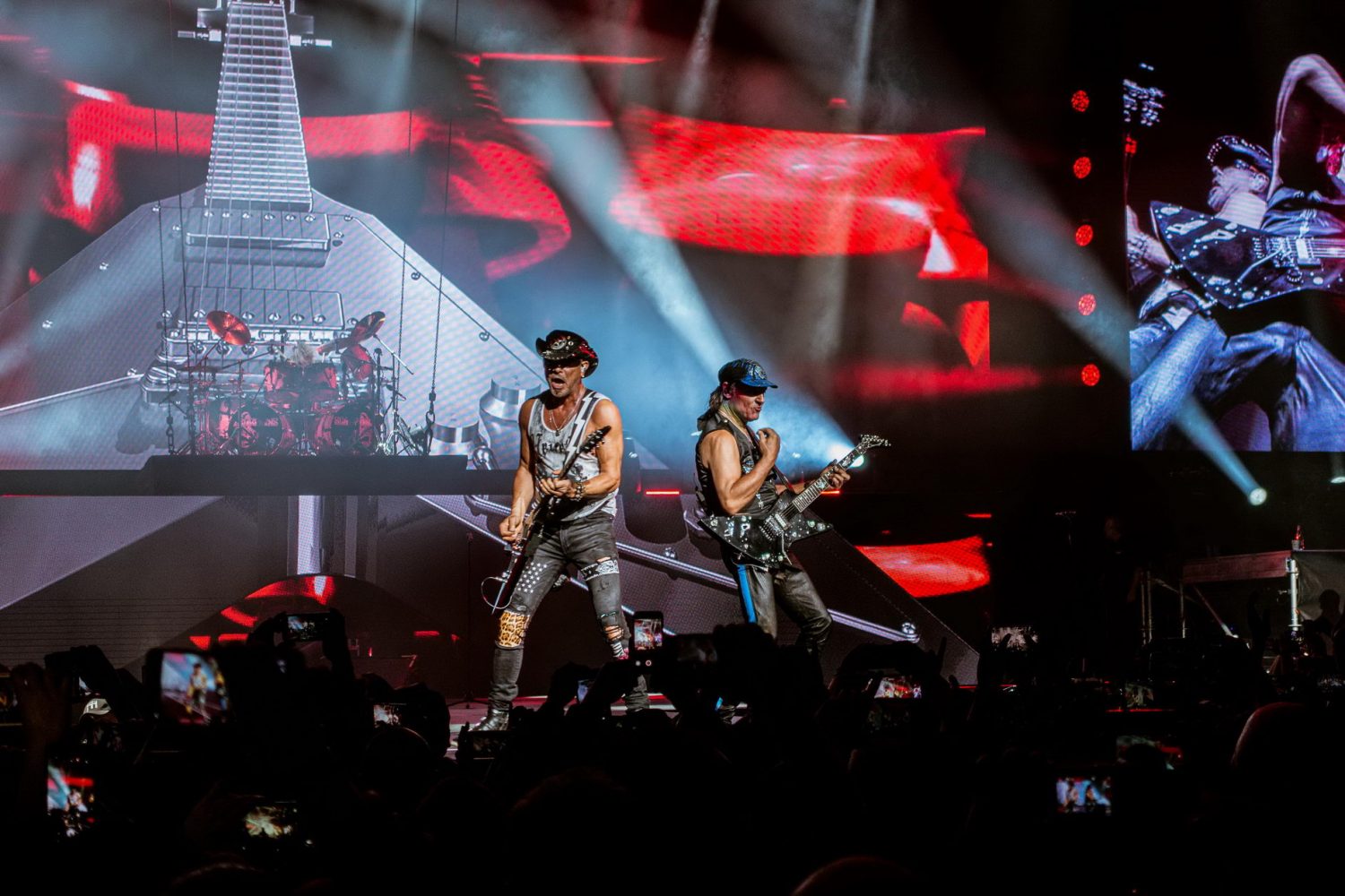 Luego de un receso de media hora y unos minutos antes de las 10:00 pm, cae el telón que cubría el escenario y SCORPIONS inicia con “Going Out With a Bang” y “Make It Real.  Con “The Zoo”, la alegría va in crescendo, gracias al efecto de “caja de voz” de la guitarra de Mattias Jabs. “Coast to Coast” es el tema donde Klaus Meine toma la guitarra, y los músicos en las cuerdas nos lanzan todos sus acordes y notas que ponen en ebullición al público; una imagen en las pantallas, evoca la guitarra preferida de Schenker, una Gibson Flying V. Luego recordaremos los 70 con el Medley de: “Top of the Bill / Steamrock Fever / Speedy’s Coming / Catch Your Train. Pasamos de lo clásico a lo nuevo con “We Built This House” canción cuya letra pudimos ver en video y tratar de seguir. “Delicate Dance”, “Send Me an Angel” fue el tema acústico, sensible y sublime.  “Wind of Change” fue un himno a la vida.  “Tease Me Please Me” una canción más movida da paso al solo de batería de Mikkey Dee, con la sorpresa de que esta se elevaba del escenario. Con “Blackout” y “Big City Nights” la euforia fue total. Luego del encore vendrían  “Still Loving You” y “Rock You Like a Hurricane”, la mejor manera de cerrar un concierto maravilloso.